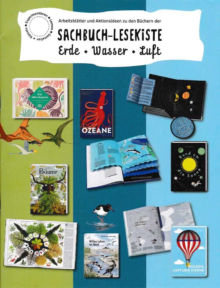 In der Sachbuch-Lesekiste befinden sich bis zu 25 anschauliche Sachbücher zu den Oberthemen "Erde", "Wasser" und "Luft". Außerdem gibt es Begleitmaterialien zu den Büchern mit unterschiedlichsten Aufgaben, sowohl digital zum Herunterladen als auch analog mit Kopiervorlagen in der Box selbst.